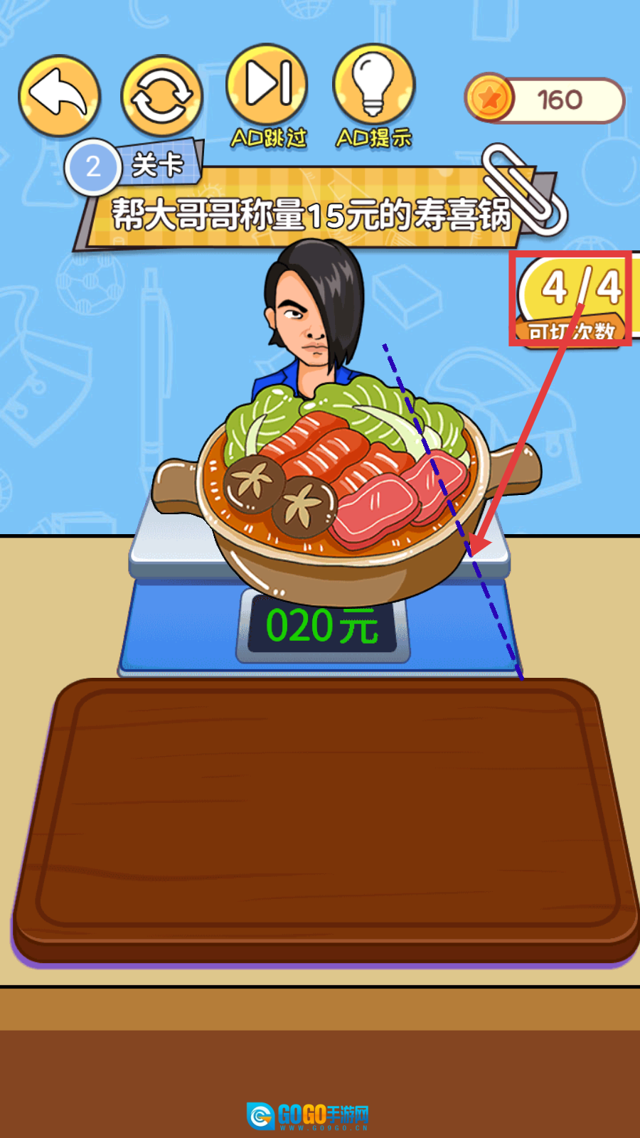 3、称量寿喜锅时,关注【4/4】可切次数,合理切割食材,使秤上金额接近【15元】,把握切割次数以完成任务。