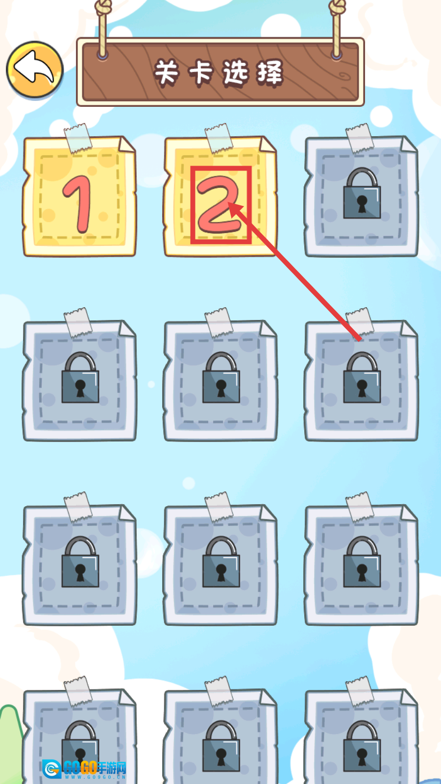 1、在【关卡选择】界面,点击标有【2】的关卡,可进入第二关挑战,其余关卡需解锁,优先推进可玩关卡。