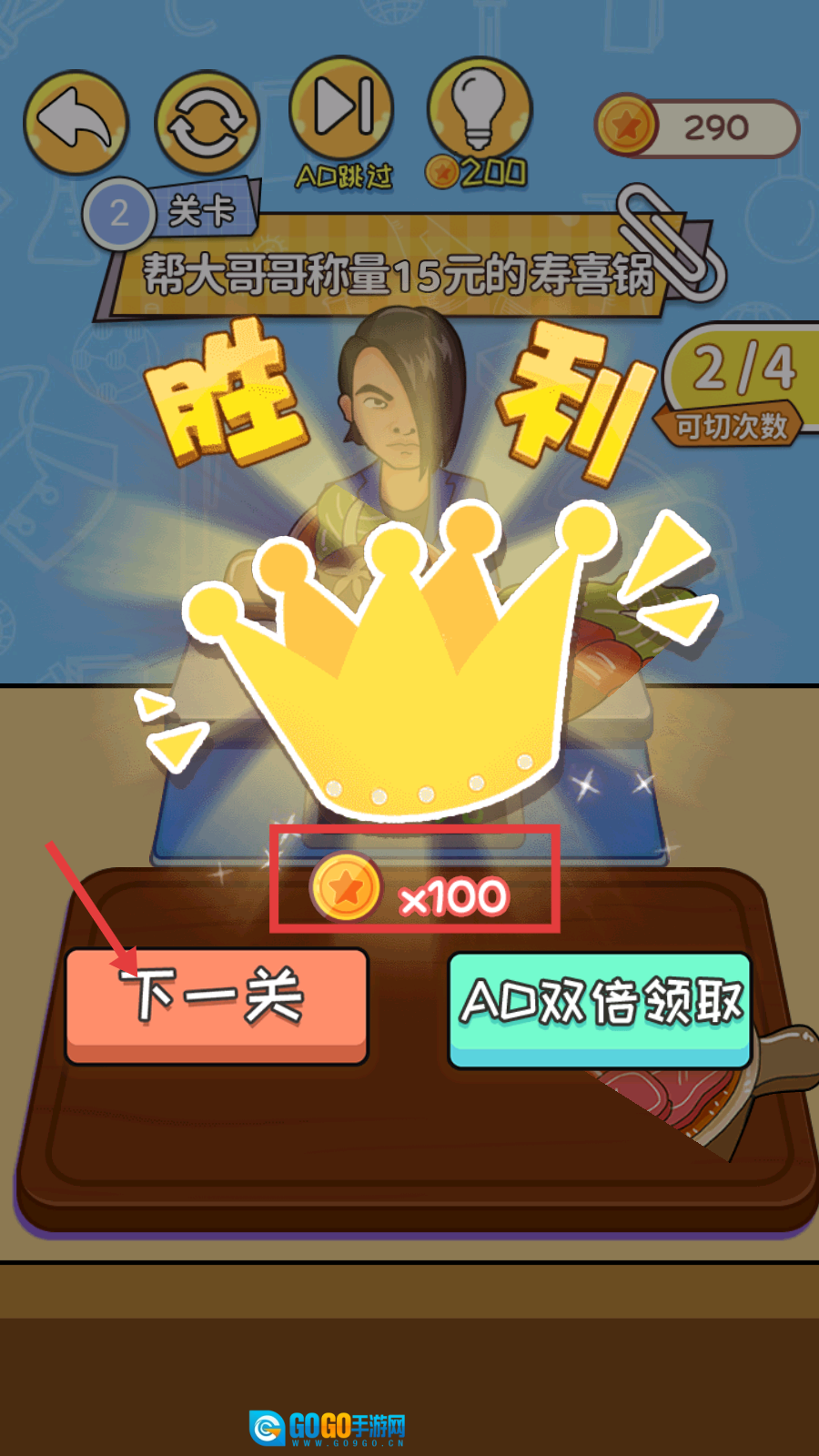 4、成功放置15元的寿喜锅后即可通关,获得【金币×100】奖励,点击【下一关】按钮继续挑战。