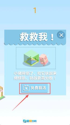 4、最后,若小猪摔倒,点击“免费复活”即可扶起小猪继续挑战更高分数。