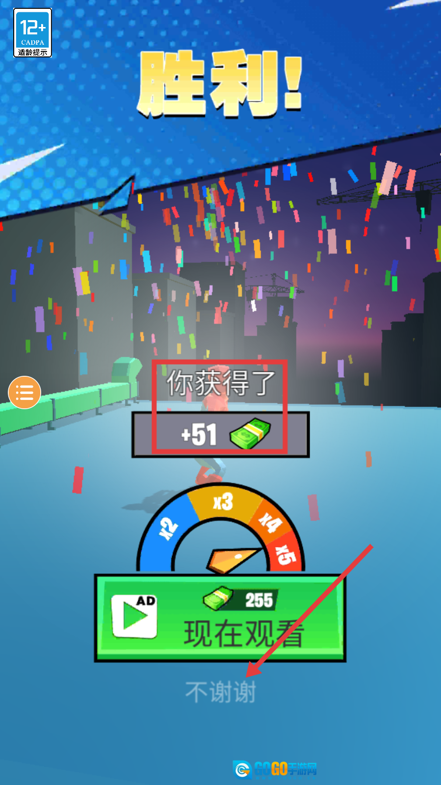 4、通关后获得+51钞票,若不想观看广告可点击【不谢谢】,继续下一关挑战积累更多资源。