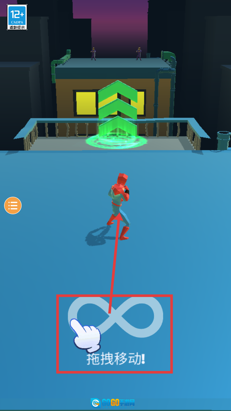 1、注意12+-CADPA适龄提示,通过【拖拽移动】操作控制角色,前往绿色箭头的传送点推进关卡。