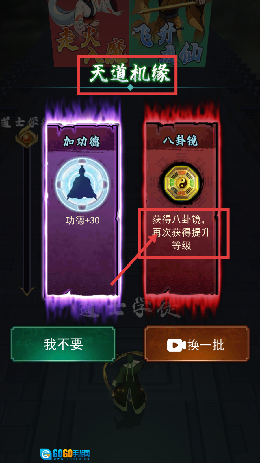 2、遇到【天道机缘】选择时,优先选【八卦镜】,可提升等级增强战力,助力降妖。
