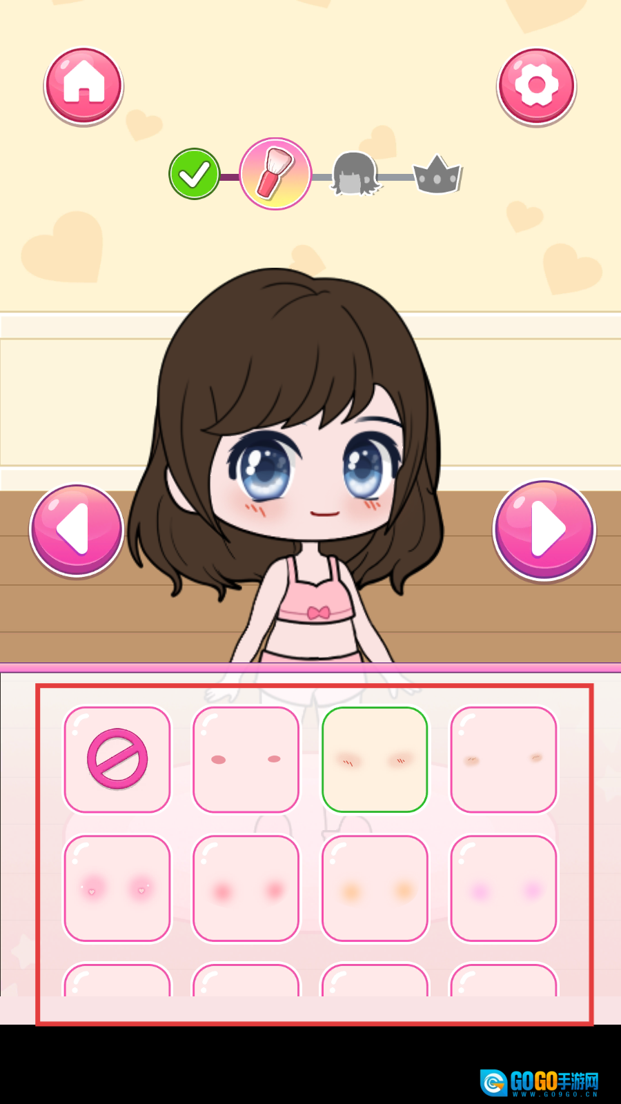 2、接着进入面容调整环节,从下方选喜欢的腮红样式,点击应用,给比比打造可爱面容。