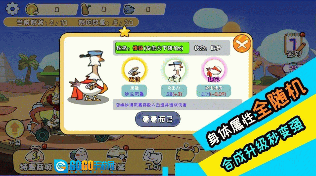 2、合成和升级最强的大鹅,打败敌人。随机合成每个都是不同的鹅,只合成你的笨鹅。