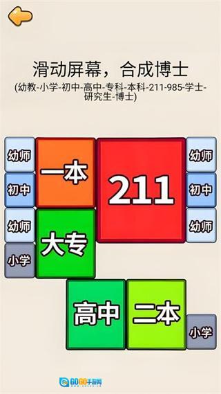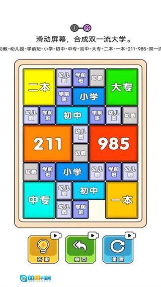 踏入这个以学历提升为核心的合成天地,方块上清晰标注着从幼儿园到顶尖学府的各个学历层级,你需要通过精准的滑动操作,将同等级的方块合成升级。每一次操作都会左右合成的进程,你要一路闯关升级,凭借缜密的布局规划与细致操作,逐步合成解锁那所梦寐以求的一流大学。