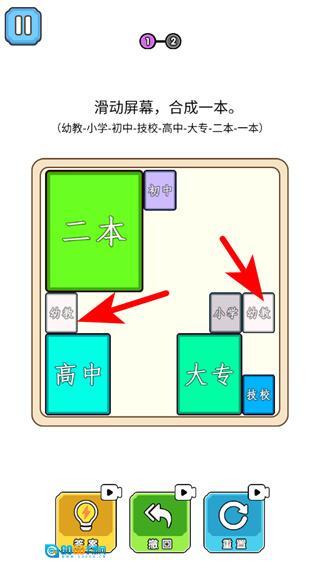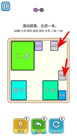 3、按照红色箭头的指示操作,持续滑动屏幕来移动小学学历方块,完成相同等级方块的合并,逐步合成更高等级的学历方块。