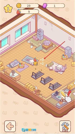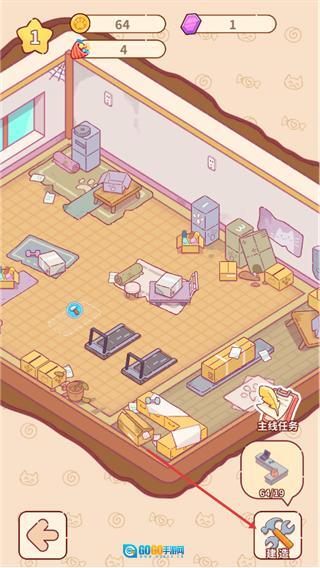 这是猫咪健身房俱乐部的内部场景,点击界面右下角的建造按钮,即可进入升级建造界面开展设施相关操作。