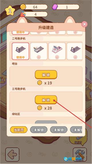 2、进入升级建造界面后,找到三号跑步机对应的解锁按钮,消耗28货币点击该按钮就能解锁该设施。