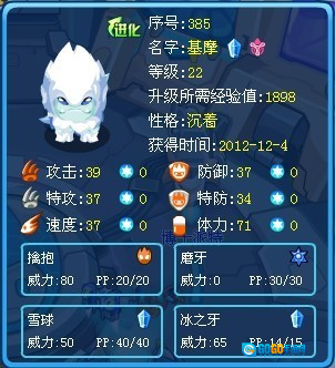 这是一只出现时间较早的精灵,不过玩家获取它的概率不算高。放到现在分析,主要是因为当时大家捕捉它的次数比较少,再加上精灵自身的战斗能力相对薄弱。尽管它的外观颜值还算不错,和同时期普通的冰系精灵相比要出色不少,但在游戏早期,冰系精灵中的王者是融合精灵古雷亚。