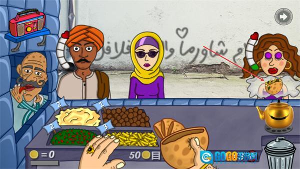 2、在这个摊位界面查看顾客的需求,依照红色箭头的指示将食物递给对应的顾客,提供食物的界面上方摆放着收音机之类的物品,与此同时要注意当前显示的进度。