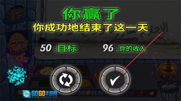 4、当界面显示“你赢了”且弹出“成功结束这一天”的提示后,可查看目标完成情况与当日收入,随后点击带有对勾标识的按钮,就能结束当前关卡的流程。