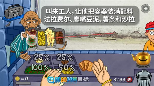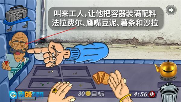 3、按照叫来工人,让他把容器装满配料的提示,呼叫界面中的工人,准备填充法拉费尔、鹰嘴豆泥、薯条和沙拉这些配料。