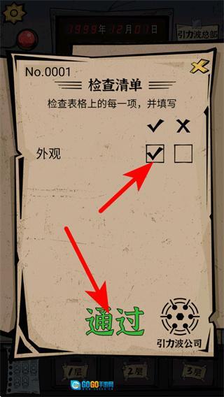 3、跟随红色箭头的指引,勾选检查清单里对应的选项框,在确认检查结果无误后触发通过判定,以此推进关卡流程。