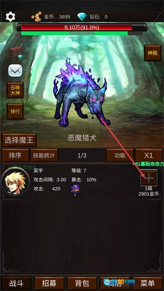 4、在魔物对应的角色界面,找到升级按钮消耗指定金币,点击后可提升其基础攻击力,增强角色的战斗能力。