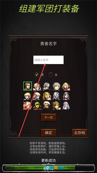 1、在角色创建界面点击请输入名字框填写勇者名字,选定性别和头像后,点击确定完成角色初始创建流程。