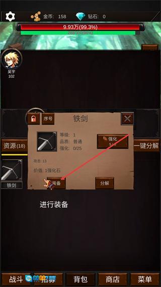 2、在背包界面打开铁剑的详情面板后,点击面板中的装备按钮,完成该武器穿戴以提升角色攻击属性。
