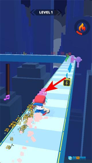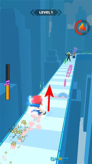 3、跟随红色箭头的指引,在跑酷过程中避开路径上的障碍物,尽可能多地收集音符来提高关卡分数,保证角色能够顺利且平稳地完成跑酷流程。