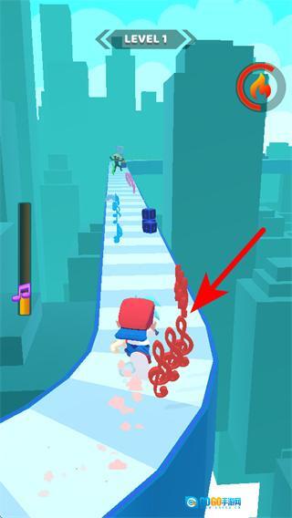 4、根据箭头的指引来操控角色朝着目标方向移动,接近关卡终点处的对手,从而达成跑酷关卡的最终挑战目标。