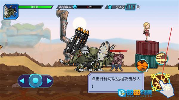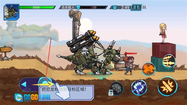1、在第1关界面里,依据提示操作移动按钮,把恐龙移至目标区域,这是开启关卡流程的必要步骤,完成这一步后,接下来就可以着手进行击杀敌人的任务了。