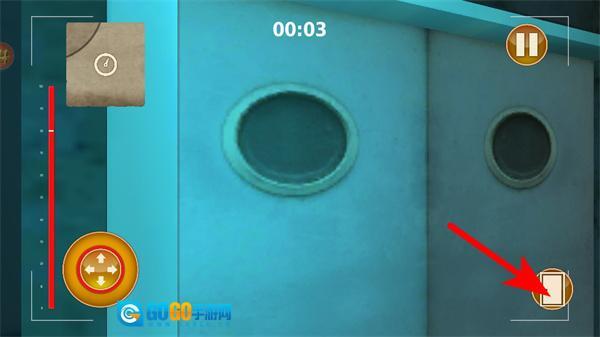 2、游戏中依照箭头指引,点击对应按钮切换场景区域,朝着安全躲藏点前进,注意观察场景布局规划移动路径。