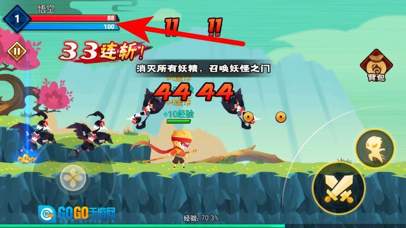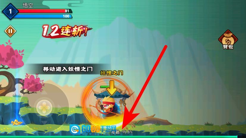 4、观察底部的经验值,控制悟空移动进入妖怪之门,即可完成当前关卡的挑战。