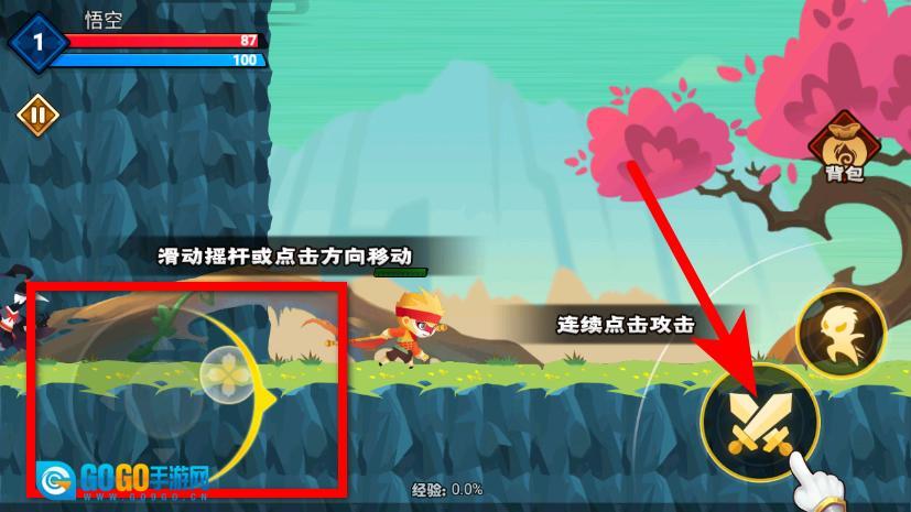 1、在关卡界面,滑动摇杆控制悟空移动,点击攻击按钮发起攻击。