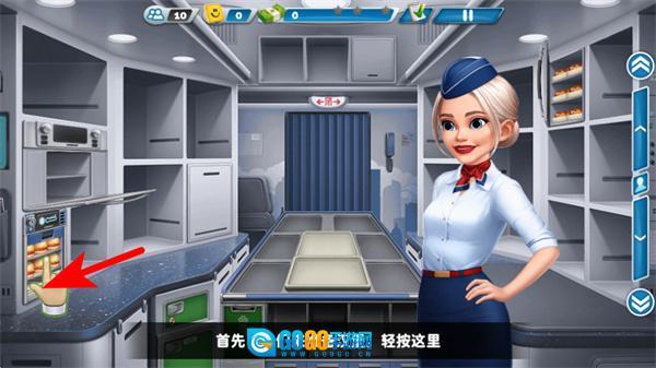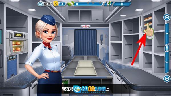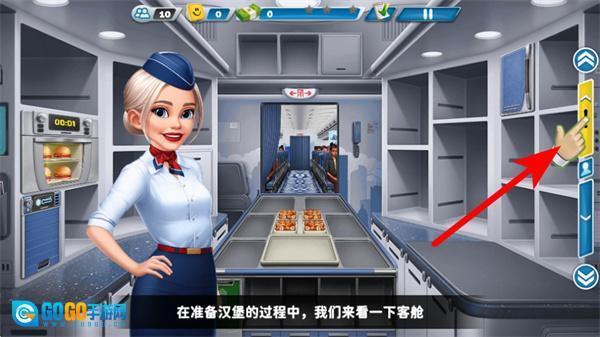 1、进入游戏界面后,点击餐食设备区域准备汉堡,这是开启空乘服务的关键操作,准确点击才能进入餐食准备流程。
