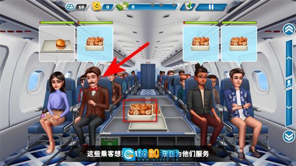 4、按箭头指引将对应餐食锦缎果推送至需求乘客处,完成乘客的餐食服务,推进空乘关卡的流程。