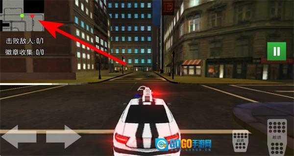 2、通过方向按钮操控警车在城市道路行驶,观察左上角小地图的任务标识。