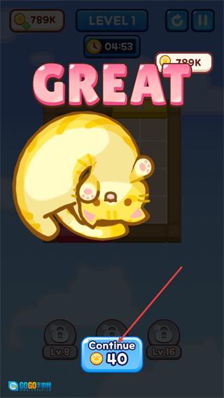 完成关卡后会出现“GREAT”的通关提示,点击“Continue”按钮领取金币奖励,就能继续挑战下一个关卡。