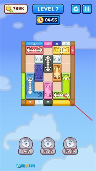 4、现在你正处于一个关卡中,这里面有颜色各异的猫咪和骨头方块。你需要依据骨头的指向来移动方块,使对应的猫咪和对应颜色的出口相匹配,以此来推动关卡的进程。