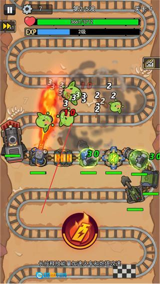 战斗时,炮塔会自动锁定并攻击轨道上的敌人,以此积累经验值(EXP),同时玩家需留意自身剩余血量。