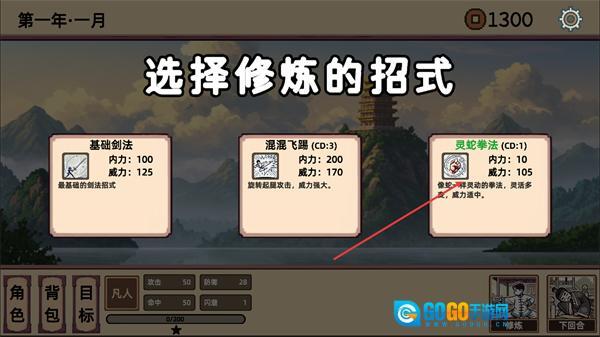 4、处于选择修炼的招式界面,可从基础剑法等招式里选其一,进行修炼来提升角色的战斗能力。