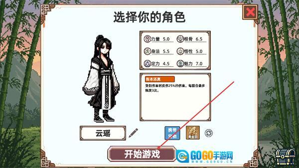 2、在选择你的角色界面,选定角色云瑶后,确认其属性与御本还真技能,点击开始游戏即可进入游玩。