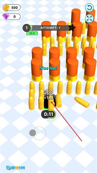 3、吞噬武器后出现SizeUp提示,代表黑洞尺寸升级,此时可收集更多物品,继续积累数值提升黑洞能力。