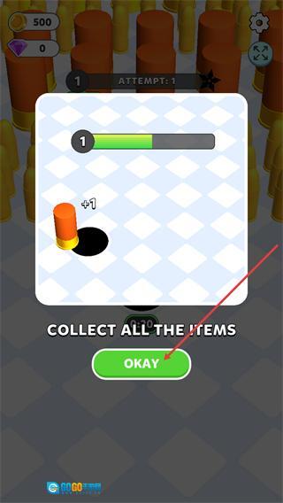 1、看到界面的教学提示后,点击下方的OKAY按钮,即可进入游戏开始收集物品的环节。