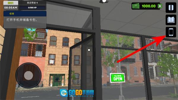 4、按照箭头指示操作,点击手机图标打开设备卡包,完成初始任务的相关要求,即可解锁后续店铺经营的各项功能与内容。