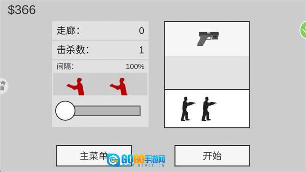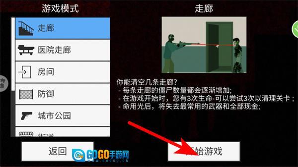 进入游戏界面后,选择走廊模式并点击开始游戏按钮,这是进入关卡的关键操作,必须准确点击才能开启任务。