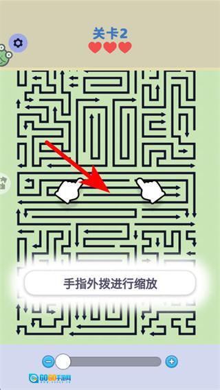 4、按照箭头的指引,用手指向外滑动来放大迷宫视图,这样能更清晰地观察路径布局,帮助完成关卡2的迷宫探索。