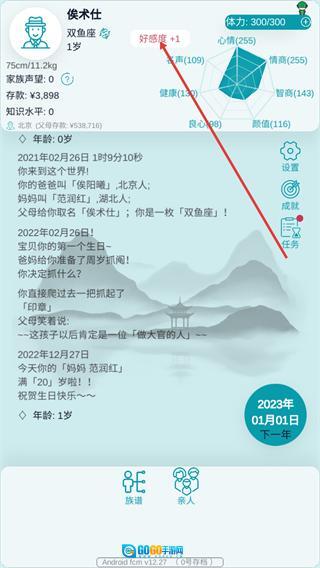 4、看到好感度+1的反馈后,点击2023年01月01日下一年按钮推进时间,体验后续的人生事件与属性变化。