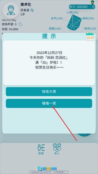 3、在妈妈生日的提示界面,选择嘻嘻一笑选项,此操作会提升与妈妈的好感度,同时推进对应的人生事件。