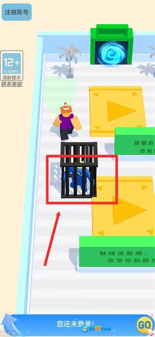 2、在游戏里,你要跟着箭头的指引行动,操控角色去触碰绿色的墙体来改变颜色,通过匹配场景里的元素来隐藏自己,朝着躲避追捕的目标一步步推进。