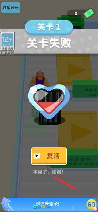 4、要是关卡没通过,可以选择复活接着挑战,也能点击“不用了,谢谢”重新开始,调整策略后再试着躲避障碍、完成通关。