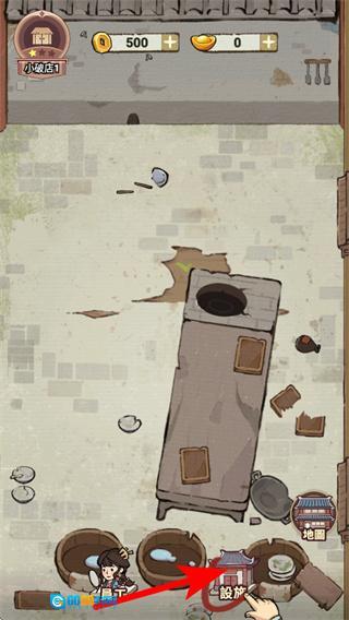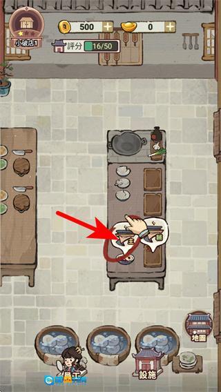 2、在游戏里跟着箭头的提示,点击厨房区域的菜品相关设施,把厨房场景布置好,朝着让店铺功能更完善的目标努力。