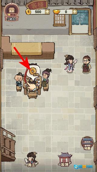 3、按照红色箭头的指引操作,点击客堂桌椅上方的金币图标,就能启动顾客消费的互动环节,以此增加店铺的收益。