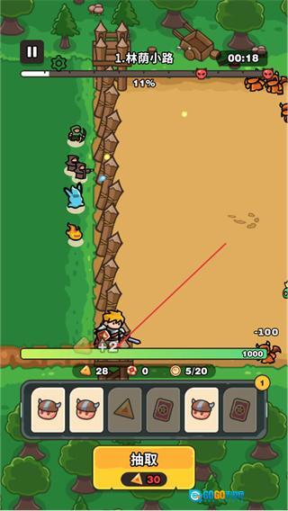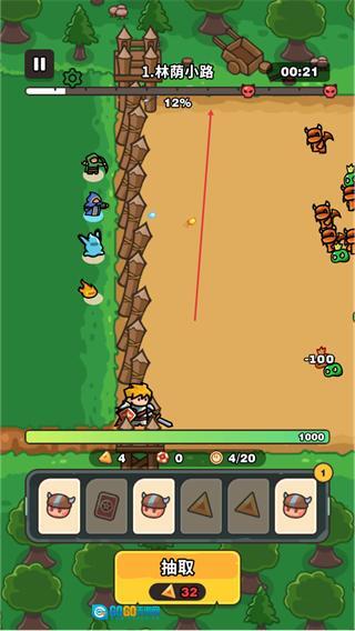 1、在“林荫小路”关卡中,通过点击抽取来获取卡牌,操控英雄对敌人发起攻击,以此积累资源。