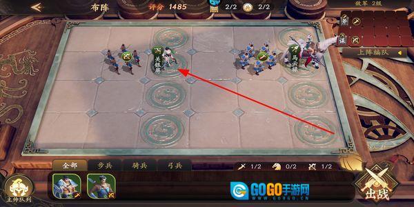 2、在布阵界面将武将放置到对应站位,搭配不同兵种组成编队,点击出战开启战斗。