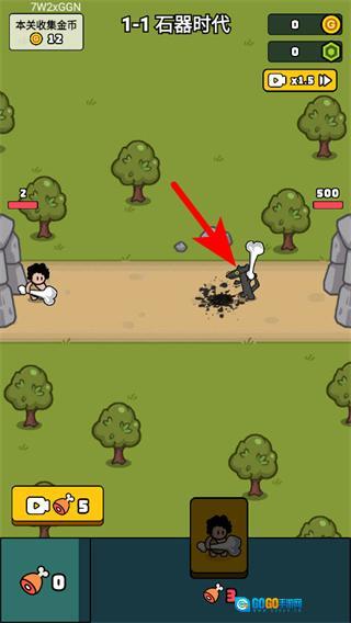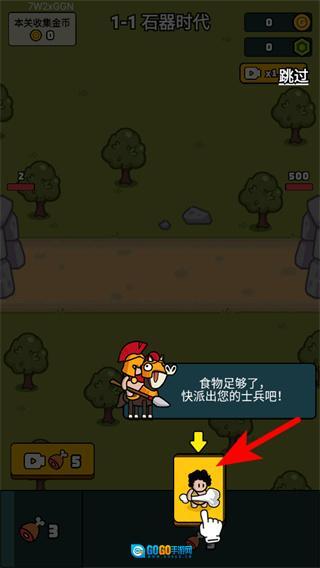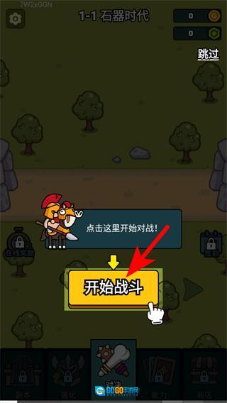 1、进入1-1石器时代关卡后,点击开始战斗按钮,就能进入对战场景,开启该关卡的出兵对战流程。