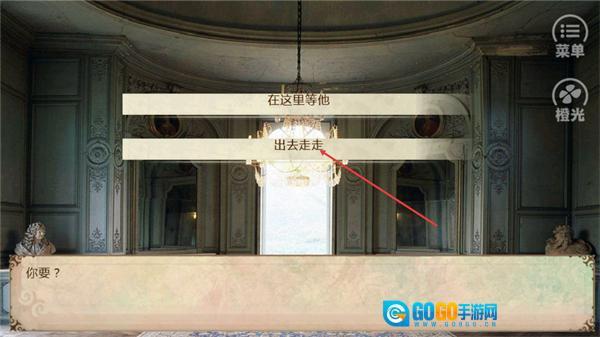 4、当前界面显示“在这里等他”和“出去走走”两个选项,选择任意一个就能触发对应的游戏剧情分支,进而继续游玩。